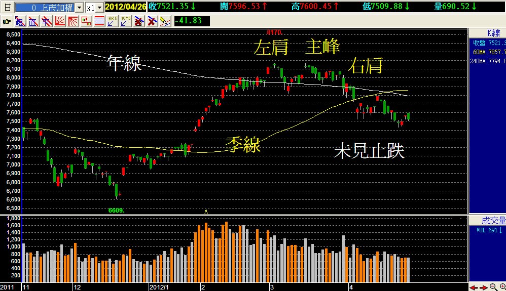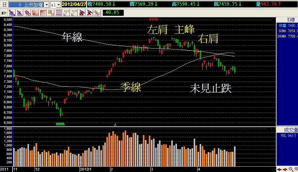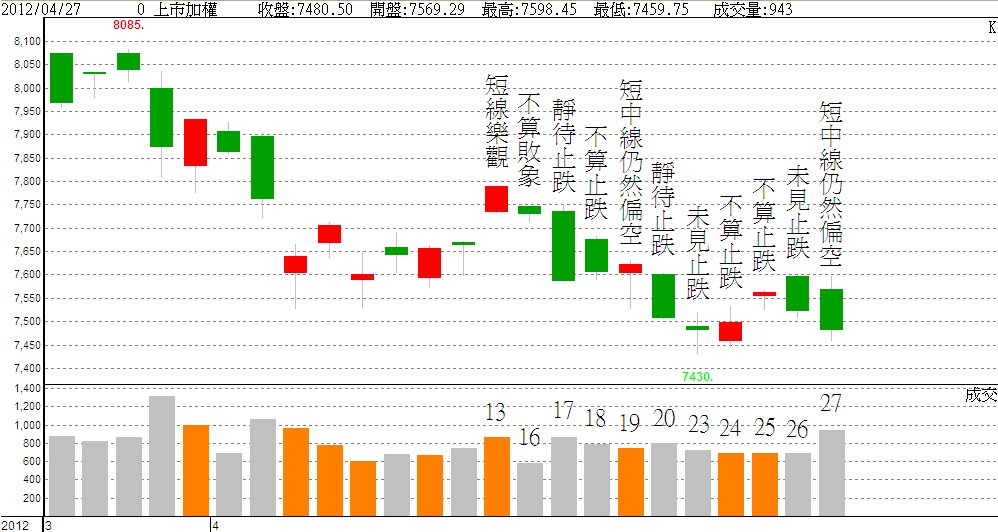 4/27:未見止跌,短中線偏空。美股續漲,台股卻不領情,仍然開高走低,短中線偏空。不僅如此,還有一件事情要注意,那就是季線已經開始走平,一旦季線 下彎就表示該季的平均成本價格往下修正。這是什麼意思呢?表示追價的情況已不再,賣方開始降價求售,買方則意興闌珊。當一季的平均成本價格向下修正,表示 長多格局已經瓦解,空頭市場準備接手了。