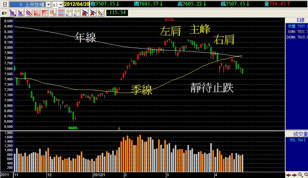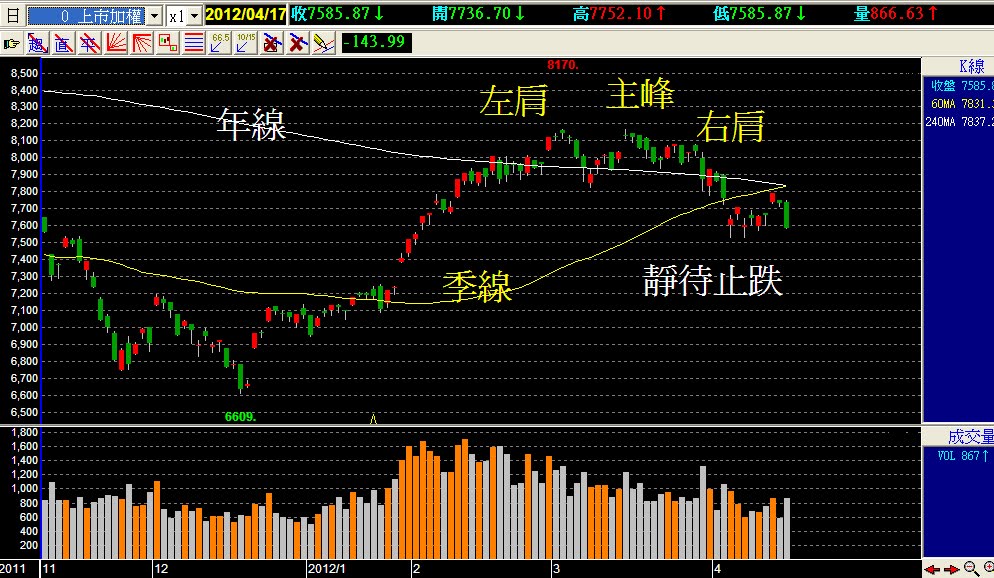 4/23:持續破底,靜待止跌。目前台股指數的頭部型態已經成型,季線保衛戰也是空方勝出,接下來只要指數無法站回季線,季線下彎恐怕是跑不了。一旦季線下彎,長空格局就宣告成立,屆時又要有一批投資人輸光資金,進駐股市忠烈祠了。