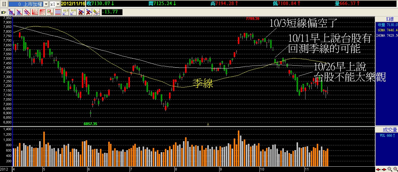 cola打從10/3就將主題定為「短線又偏空了」,直到10/9都還是短中線偏空,10/11早上針對美股分析時還特別交待台股有回測季線的可能,10/19早上在美股分析中提到長線走勢規劃,10/20經由美股大跌驗證了cola的盤感,但礙於秘密花園讀者的權益不便公開cola對於台股接下來的長線走勢規劃。10/26早上在美股分析中總結,既然美股沒有出現止跌訊號,台股也不能太過樂觀,結果台股大跌百點。直到目前,我們都還是能夠貼近盤勢,每天做出客觀務實的分析與建議,這就是活用技術分析成果。只要長期訂閱秘密花園的文章,讀者就能在邊學邊做的情況下學會這套「化繁為簡」的技術分析,將技術分析活用在自己的操作標的。