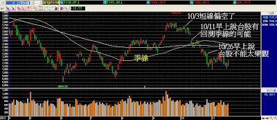 cola打從10/3就將主題定為「短線又偏空了」,直到10/9都還是短中線偏空,10/11早上針對美股分析時還特別交待台股有回測季線的可能,10/19早上在美股分析中提到長線走勢規劃,10/20經由美股大跌驗證了cola的盤感,但礙於秘密花園讀者的權益不便公開cola對於台股接下來的長線走勢規劃。10/26早上在美股分析中總結,既然美股沒有出現止跌訊號,台股也不能太過樂觀,結果台股大跌百點。直到目前,我們都還是能夠貼近盤勢,每天做出客觀務實的分析與建議,這就是活用技術分析成果。只要長期訂閱秘密花園的文章,讀者就能在邊學邊做的情況下學會這套「化繁為簡」的技術分析,將技術分析活用在自己的操作標的。